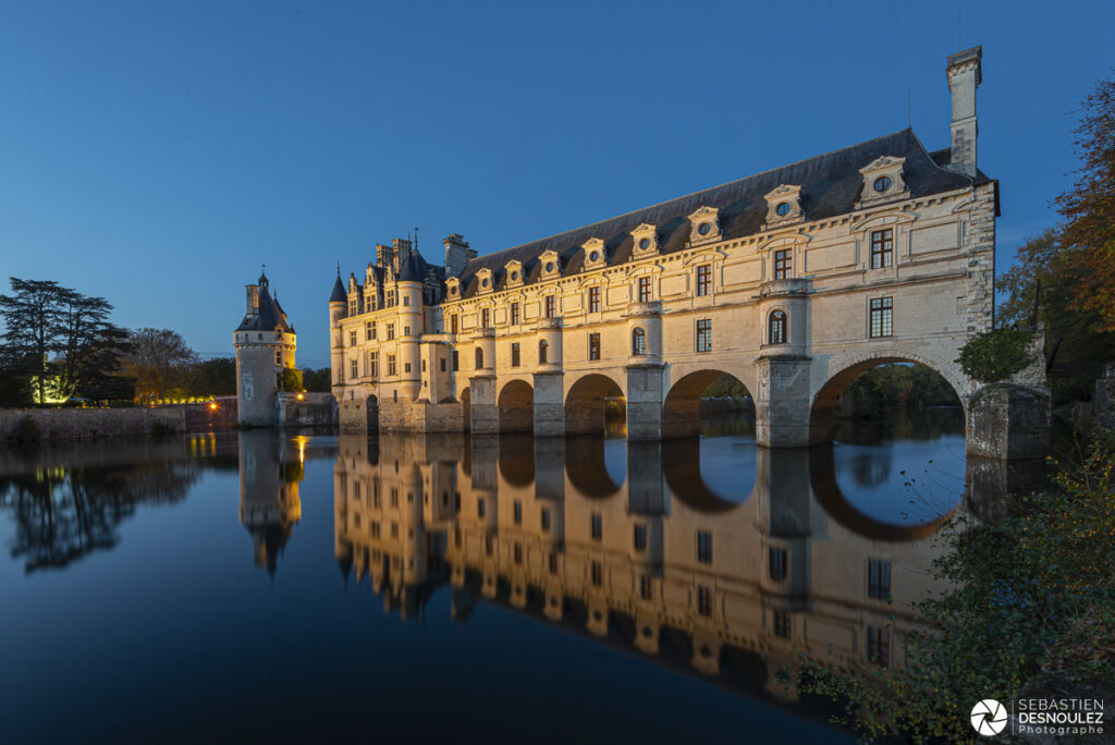 Photographies du Château de Chenonceau à la tombée de la nuit – Reflets et lumière dorée