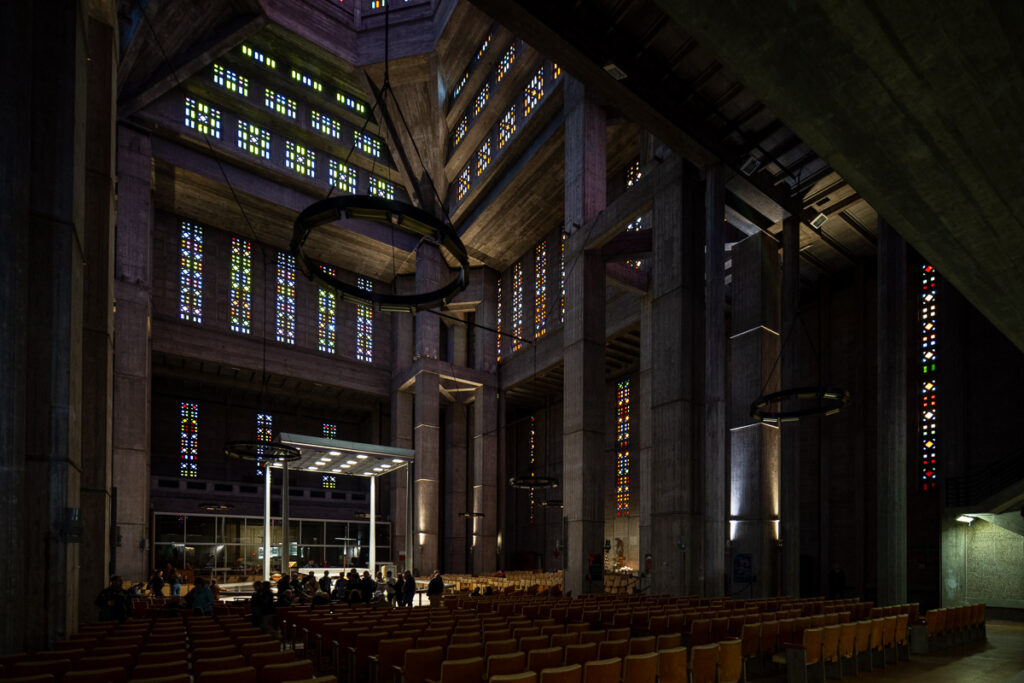 En entrant sous la tour-lanterne, un détail a retenu mon attention : l’escalier en colimaçon plaqué contre la paroi intérieure. Brutal, fonctionnel, sans ornement. Cette structure m’a évoqué l’univers d’un réacteur nucléaire ou un décor tout droit sorti de la science-fiction. L’atmosphère évoque presque l’intérieur de l’Étoile de la mort dans Star Wars, épisode IV : monumental, géométrique, froid, et pourtant fascinant. Cette comparaison inattendue souligne à quel point cette architecture dépasse les codes habituels du lieu de culte.