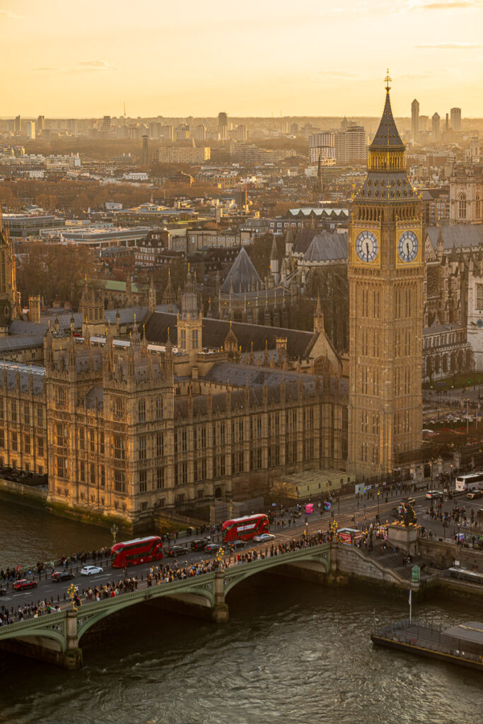 Big Ben and the banks of the River Thames embody the ultimate London postcard image. I chose to photograph these iconic locations at dusk, when the golden light transforms the ordinary into cinematic atmosphere. As the day fades, silhouettes emerge against a pastel sky, while red buses, passers-by and boats animate the waterfront.