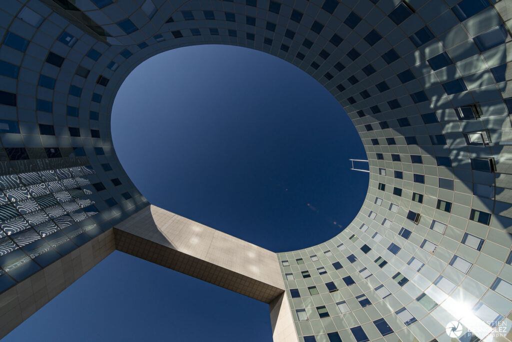 Explore a contemporary vision of La Défense through this photograph of Ellipse Plaza, where curved lines and natural light shape a spectacular architectural space.