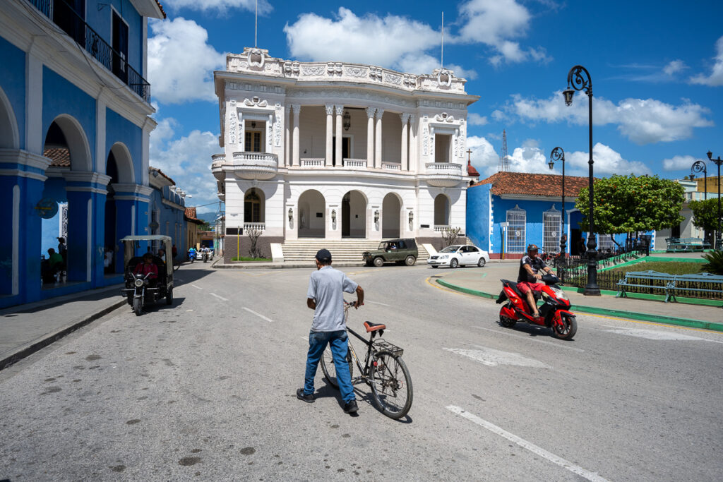 Bathed in ochre light, the market contrasts with the city’s vibrant architecture. Blue buildings with arcades shelter vendors under shaded porches in a peaceful atmosphere. A man pushes his bicycle down a wide avenue while a red scooter and green military vehicle cross the square. In the background, a large white neoclassical building seems to watch over the scene. This mix of colors, architecture, and rhythms of life forms a vivid and sincere portrait of Sancti Spíritus.