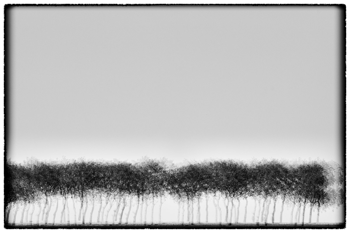 Les photographies d’arbres jouent sur deux approches complémentaires. Certaines images montrent un, deux ou trois arbres photographiés en hiver, volontairement décalés à la prise de vue. Chaque tronc reste identifiable, et la superposition crée un léger glissement graphique, visible dans les branches nues. La simplicité du sujet, isolé sur un horizon clair, permet une lecture directe de la structure végétale et du rythme induit par la répétition.