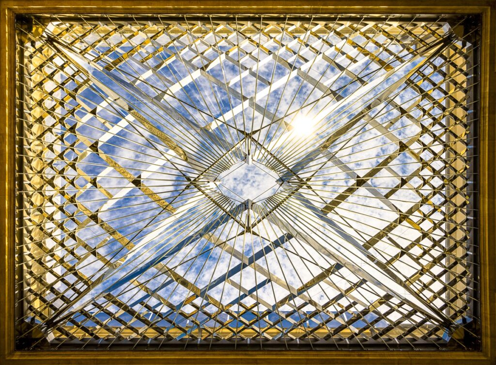 Lors de ma prise de vues, la structure d’acier réfléchissait en partie les tons chauds de la façade du bâtiment, en partie les tons argentés de la lumière vive du soleil. Le tout sur fond de ciel.