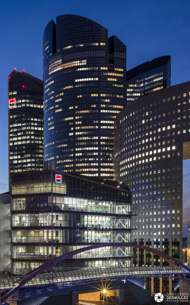 Japan Bridge, tours Société Générale et Pacific à la tombée de la nuit, La Défense
