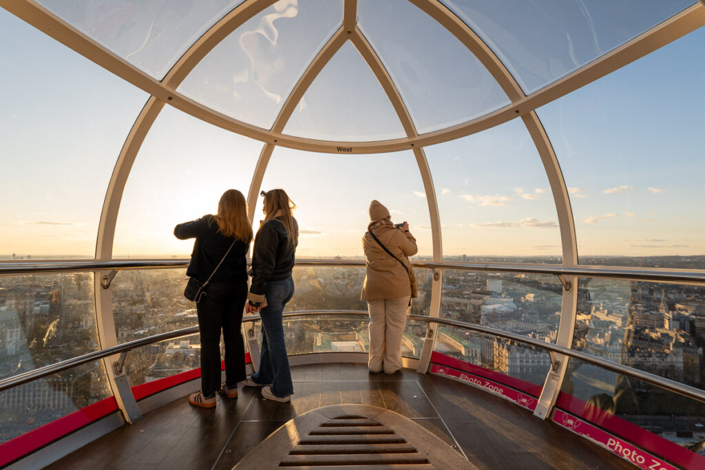 En cette fin d’après-midi de mars, le soleil rasant donne à la ville une teinte dorée, mettant en valeur les arêtes des bâtiments et les reflets dans le fleuve. Le verre bombé des capsules capte la lumière, créant des jeux d’ombres douces sur les visiteurs absorbés par la vue. À l’ouest, le regard s’échappe vers l’horizon brumeux, tandis qu’à l’est, la City se dresse fièrement avec ses gratte-ciel de verre et d’acier.