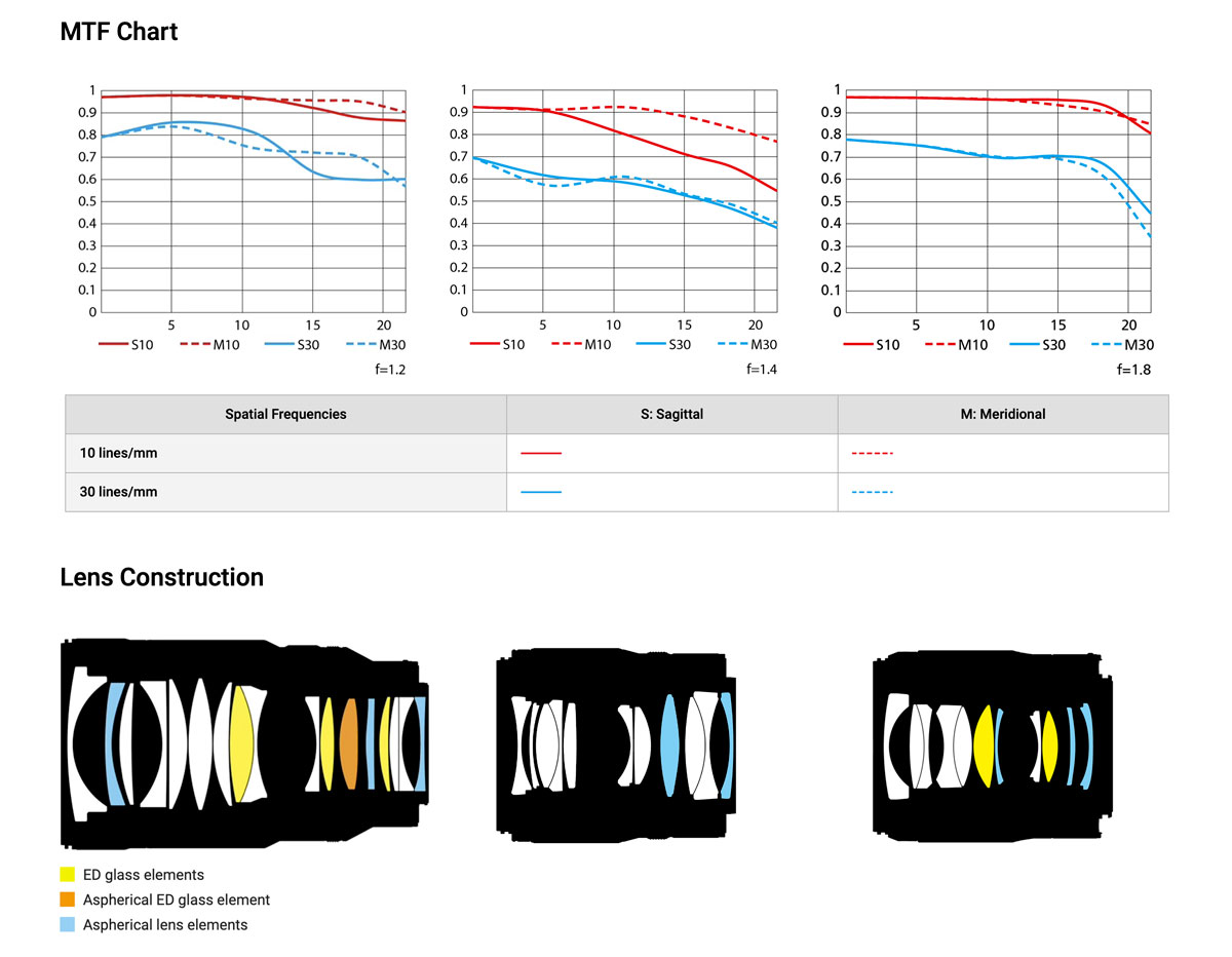 1. MTF (Modulation Transfer Function) : c’est une manière de mesurer la capacité d’un objectif à restituer les détails fins et le contraste sur l’ensemble de l’image. Sur la plupart des courbes, l’axe horizontal indique la distance entre le centre de l’image et les bords, tandis que l’axe vertical (de 0 à 1) représente le contraste. Plusieurs courbes sont tracées pour différentes fréquences spatiales, souvent 10 et 30 lignes par millimètre, et pour deux directions dans l’image (sagittale et méridienne). En règle générale, plus les courbes sont hautes et « droites », mieux l’objectif conserve contraste et résolution, mais un MTF ne raconte qu’une partie de l’histoire et ne tient pas compte de tous les aspects du rendu comme la couleur, le flare ou le bokeh.