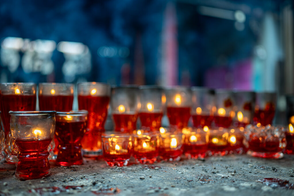 À travers mon objectif, j’ai cherché à capturer l’intensité lumineuse et spirituelle de la pagode. Les bougies rouges, les encens qui brûlent lentement et les reflets des lanternes créent une palette de couleurs riches et contrastées.