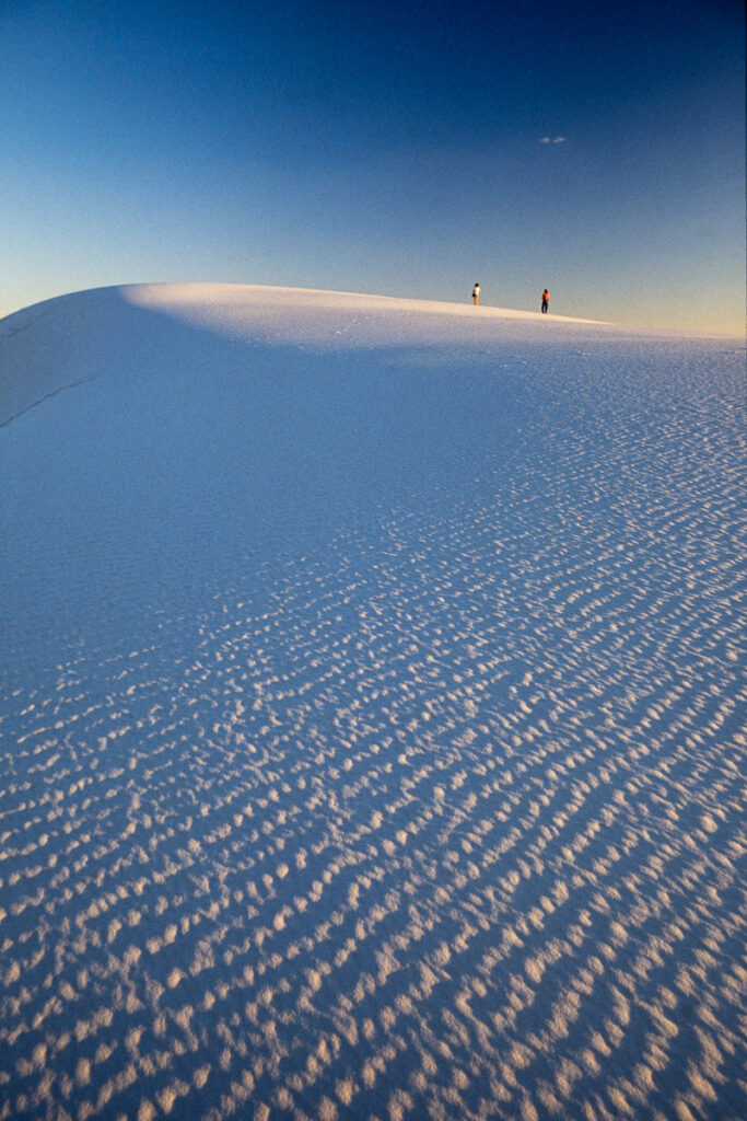 Les couleurs, fidèles au rendu du film Fujichrome de l’époque, renforcent l’atmosphère paisible et chaude de cette fin de journée dans le désert de gypse. Le dégradé du ciel, subtil et soyeux, contraste avec la texture marquée des ondulations du sable, formant une composition à la fois géométrique et organique.