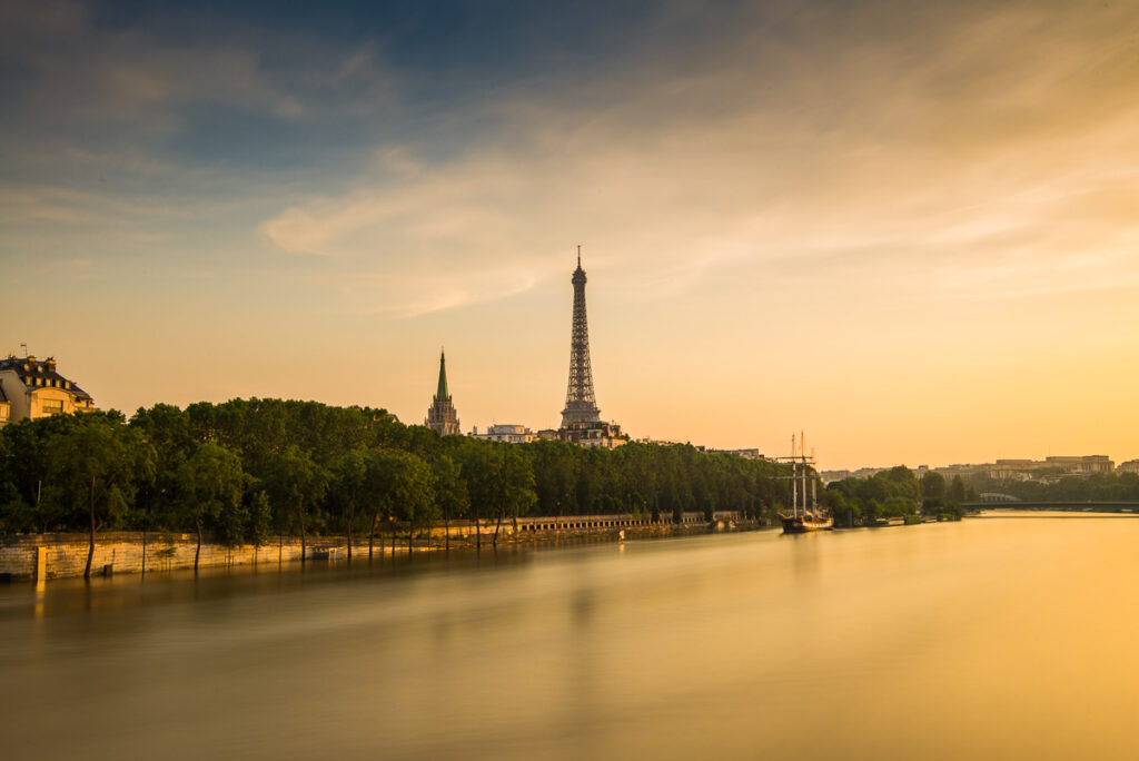 Seule la tour Eiffel et quelques toits émergent au dessus de la canopée. Un voilier à trois mats, amarré à une île à proximité, ondule imperceptiblement dans le courant.
