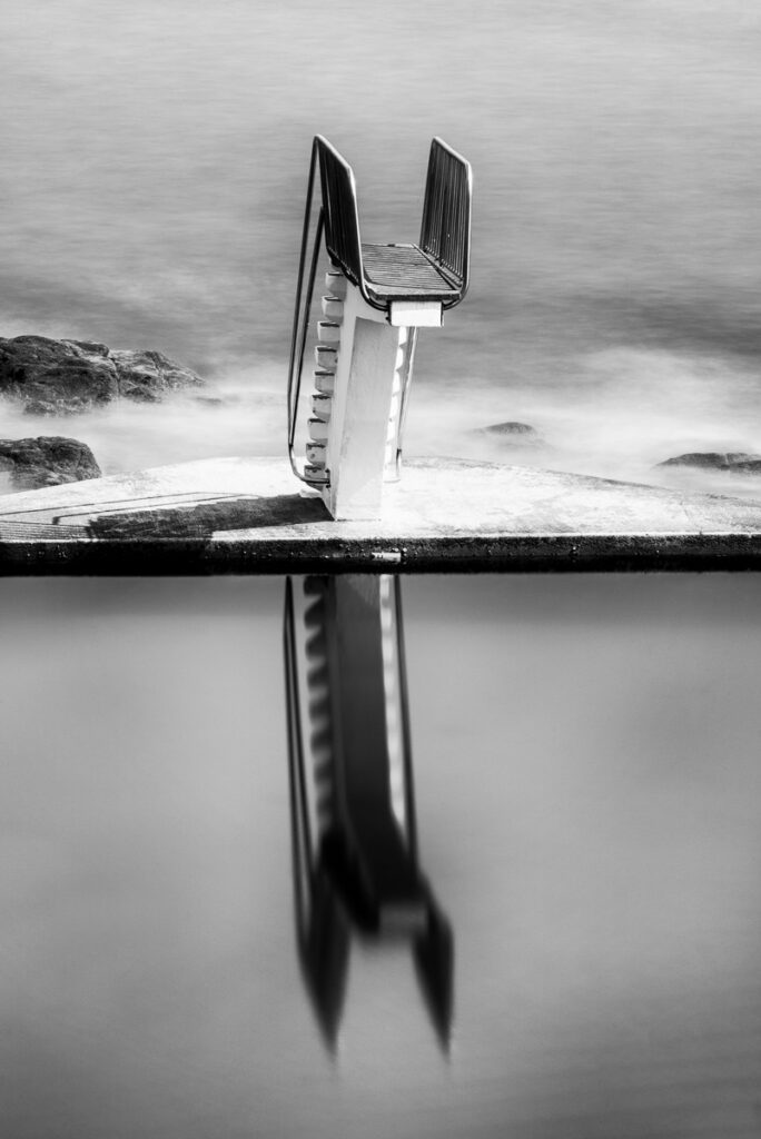 Au-dessus, le monde “extérieur”, la mer, les rochers, l’énergie du littoral. En dessous, le monde “intérieur”, une surface calme, un miroir, une profondeur qui semble absorber la lumière. Le plongeoir est le lien entre ces deux espaces. Il appartient au béton, mais il pointe vers l’eau. Il est à la fois direction, signe, et outil.