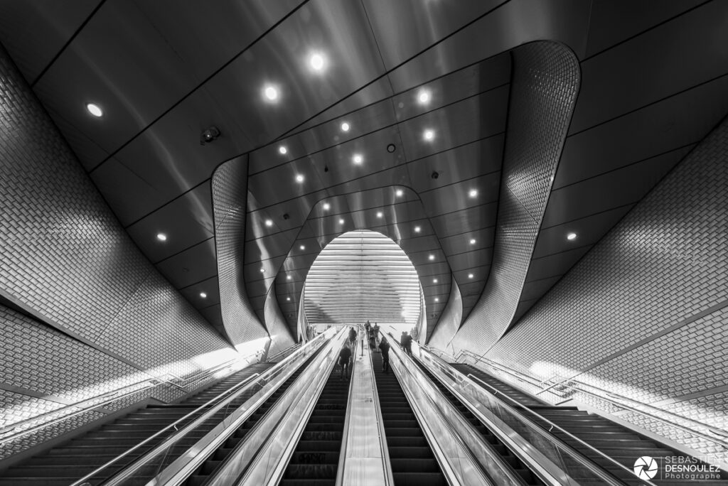 Lors de cette prise de vue, j’ai été attiré par la lumière dorée qui pénétrait depuis le sommet, contrastant fortement avec les surfaces métalliques et les lignes organiques du lieu. Le flux des usagers sur les escalators renforçait l’aspect vivant de cette architecture audacieuse.