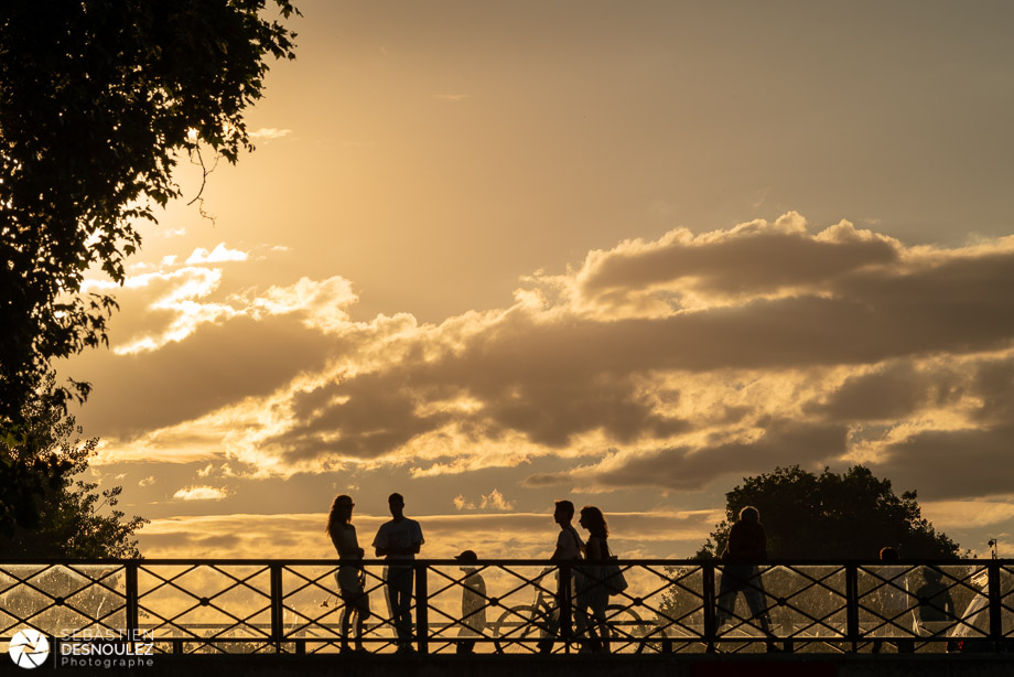 Chaque photo témoigne d’un moment de vie : un couple profitant de l’ombre des saules pleureurs, des amis allongés sur les pavés, des enfants riant au bord de l’eau. En fin de journée, la lumière dorée du soleil couchant enveloppe les façades haussmanniennes, conférant à Paris une ambiance cinématographique.