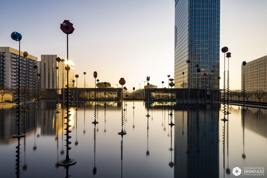 Photographie du bassin Takis à La Défense – Lever de soleil en pose longue