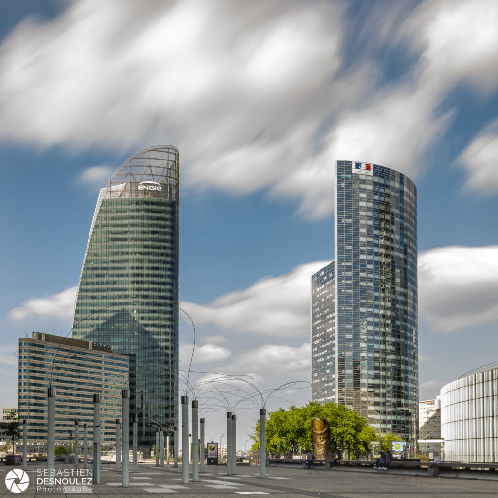 Photographie des tours Engie, Sequoia et de l’œuvre Utsurohi à La Défense – Architecture et poésie du vent